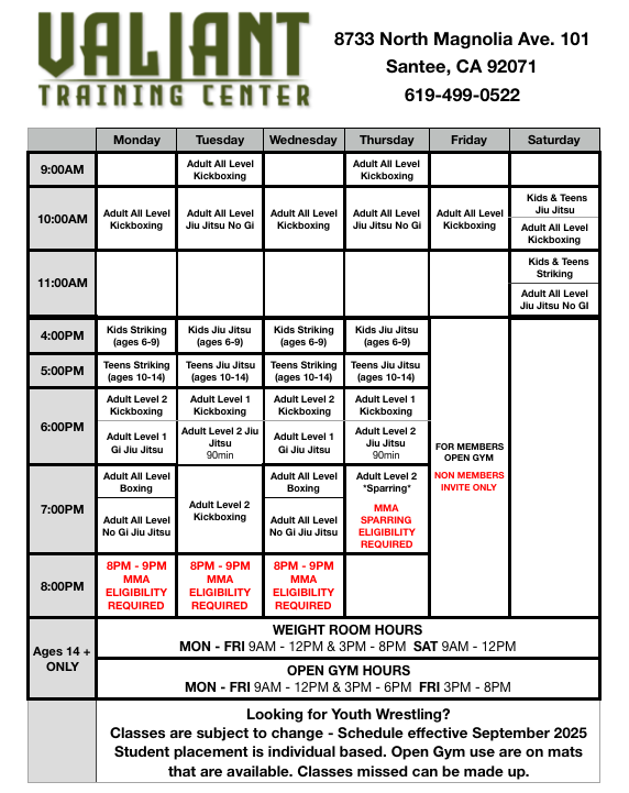 Schedule Class Schedule CONTACT US mixed martial arts Valiant Training Center 8733 N Magnolia Ave #101, Santee, CA 92071(619) 499-0522Valiantmixedmartialarts@gmail.com CONTACT US
